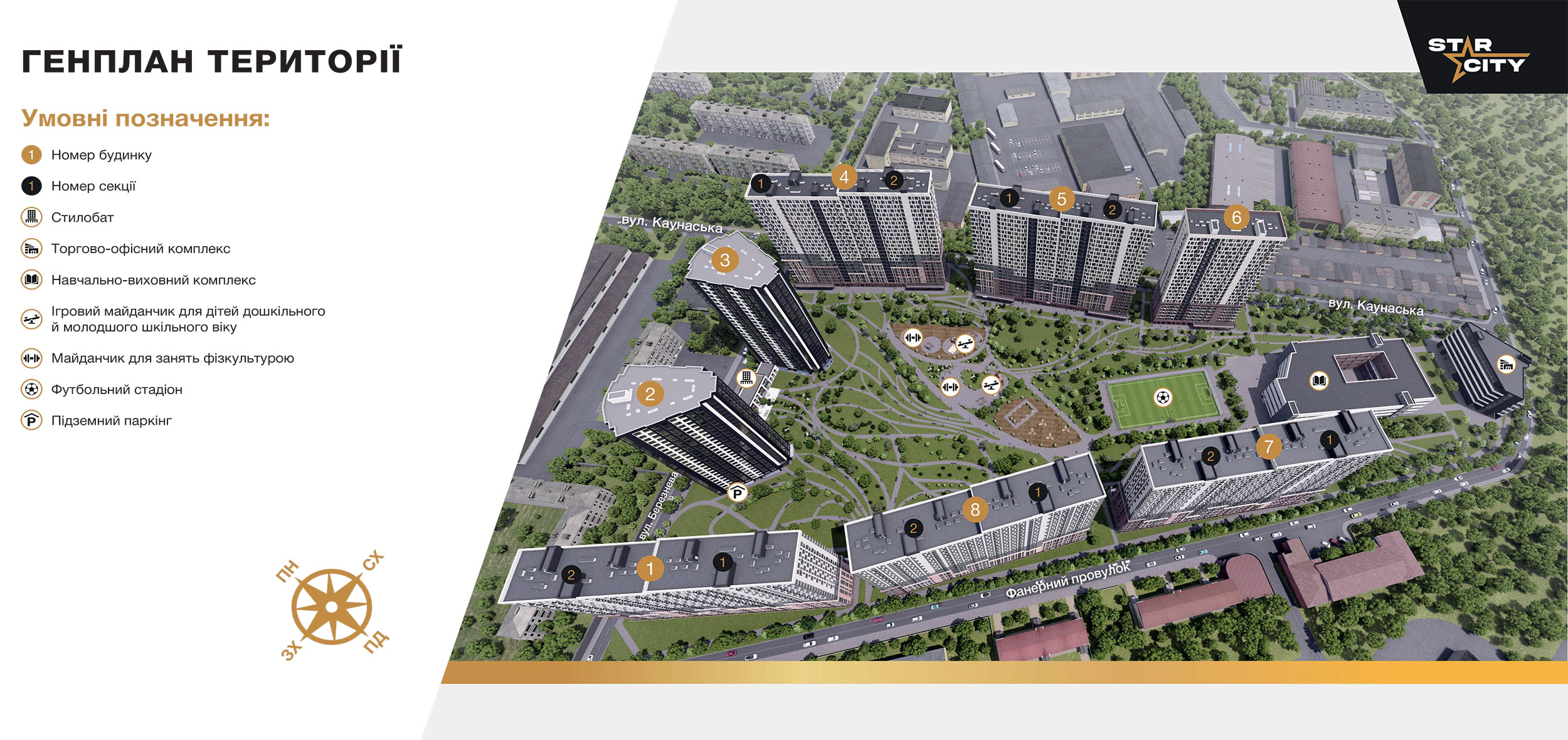 Жилые дома многофункционального комплекса Star City расположены таким образом, чтобы создать единый большой двор. В отдельном здании запроектированы трехэтажный детский сад на 115 мест и 4-этажная школа-гимназия на 660 мест, рядом также разместится торгово-офисный центр. Предусмотрены футбольный стадион и большой освещенный парк с зонами отдыха и прогулочными аллеями, детские игровые зоны и спортивные площадки. Первые этажи домов отведены под помещения коммерческого назначения: офисы, магазины, кафе и рестораны, спортивный зал, химчистки и другие сервисы.